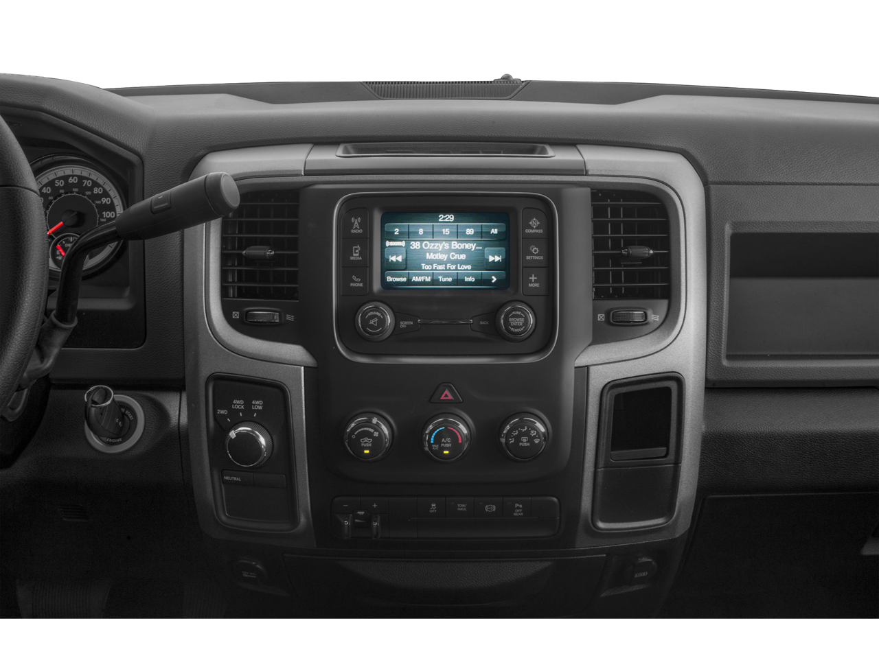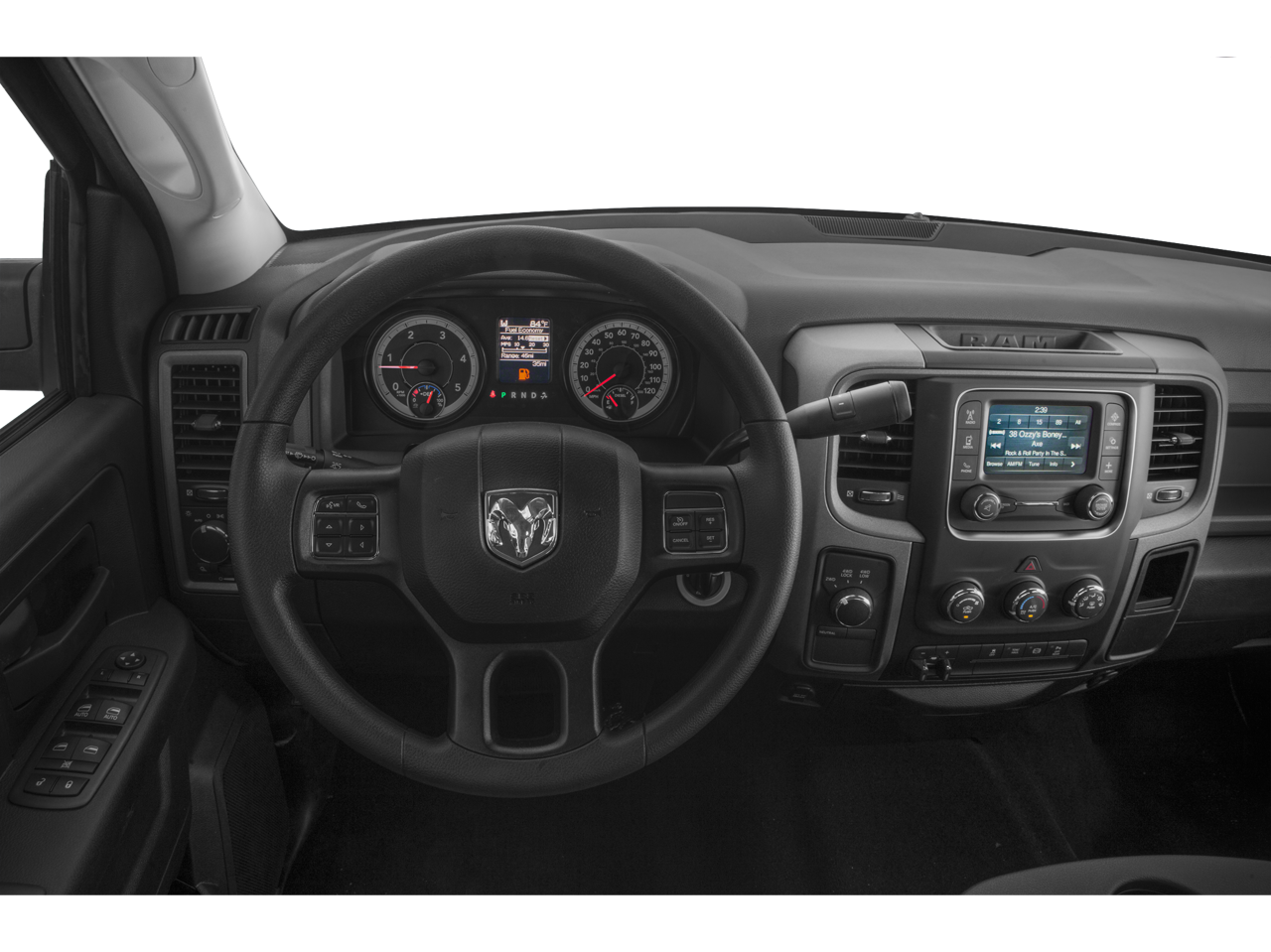 Below is all the standard equipment Heavy Duty Snow Plow Prep Group, Popular Equipment Group (1-Yr SiriusXM Radio Service, 40/20/40 Split Bench Seat, Carpet Floor Covering, Cloth 40/20/40 Bench Seat, For More Info, Call 800-643-2112, Front & Rear Floor Mats, Rear Folding Seat, Remote Keyless Entry, and SiriusXM Satellite Radio), Quick Order Package 22A Tradesman (Front Armrest w/Cupholders), 220 Amp Alternator, 3.73 Rear Axle Ratio, 4-Wheel Disc Brakes, 5.0 Touchscreen Display, 6 Speakers, ABS brakes, Air Conditioning, AM/FM radio, Black Exterior Mirrors, Brake assist, Charge Only Remote USB Port, Clearance Lamps, Continental Radio Manufacturer, Delay-off headlights, Driver door bin, Dual front impact airbags, Dual front side impact airbags, Electric Shift-On-The-Fly Transfer Case, Electronic Stability Control, Electronically Controlled Throttle, Exterior Mirrors w/Heating Element, Front anti-roll bar, Front Bumper Sight Shields, Front Center Armrest, Fully automatic headlights, GPS Antenna Input, Heated door mirrors, Heavy Duty Vinyl 40/20/40 Split Bench Seat, Hemi Badge, Integrated Voice Command w/Bluetooth®, Locking Tailgate, Low tire pressure warning, Manufacturer's Statement of Origin, Media Hub (USB, AUX), Next Generation Engine Controller, Occupant sensing airbag, Overhead airbag, Overhead Console, ParkSense Rear Park Assist System, ParkView Rear Back-Up Camera, Passenger door bin, Power door mirrors, Power steering, Power windows, Radio data system, Radio: Uconnect 3.0 AM/FM, Radio: Uconnect 5.0 AM/FM/BT, Rear seat center armrest, Rear step bumper, Rear View Auto Dim Mirror w/Display, Rear View Mirror w/Microphone, Rear Wheel Spats, Speed control, Storage Tray, Tachometer, Temperature & Compass Gauge, Tilt steering wheel, Tip Start, Traction control, Trailer Brake Control, Transmission Oil Cooler, Variably intermittent wipers, Vendor Painted Cargo Box Tracking, Voltmeter, and Wheels: 18 x 8.0 Steel.