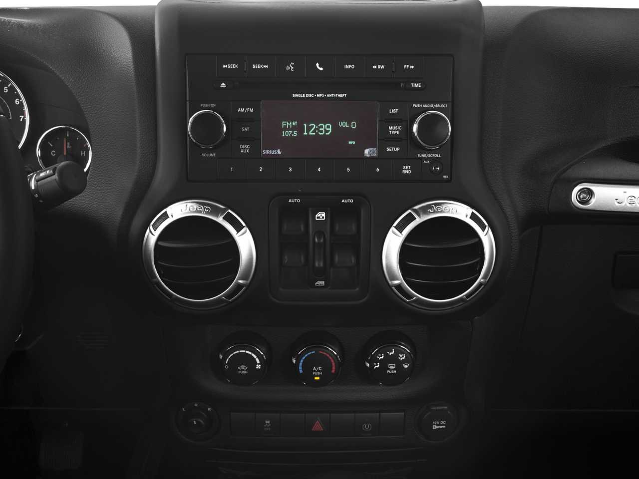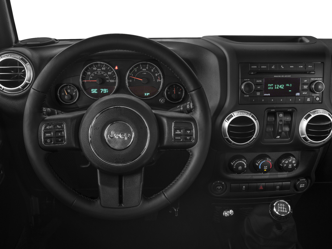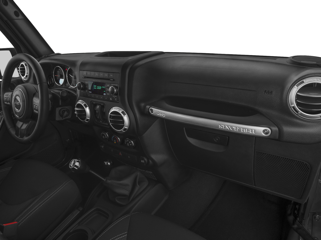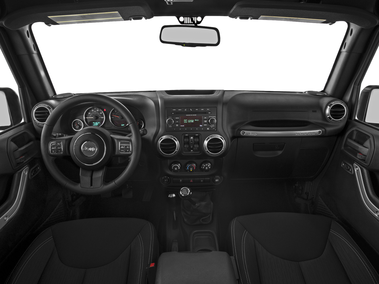 Below is all the standard equipment Connectivity Group (Leather Wrapped Steering Wheel, Remote USB Port, Tire Pressure Monitoring Display, Uconnect Voice Command w/Bluetooth®, and Vehicle Information Center), Quick Order Package 23G (Body Color Appliques Front Bumper, Body Color Appliques Rear Bumper, and Body Color/Accent Color Grille), Black 3-Piece Hard Top, Driver Height Adjuster Seat, Freedom Panel Storage Bag, Front Seat Back Map Pockets, Heated Front Seats, Leather Trimmed Bucket Seats, Rear Window Defroster, Rear Window Wiper/Washer, 18 x 7.5 Polished Satin Carbon Wheels, 3.21 Rear Axle Ratio, 4-Wheel Disc Brakes, 40GB Hard Drive w/28GB Available, 5-Year SiriusXM Travel Link Service, 6.5 Touchscreen Display, 8 Speakers, ABS brakes, Air Conditioning, Air Conditioning w/Auto Temperature Control, Air Filtering, Alloy wheels, Alpine 9-Speaker w/All Weather Subwoofer, AM/FM radio: SiriusXM, Anti-Spin Differential Rear Axle, Audio Jack Input for Mobile Devices, Auto-dimming Rear-View mirror, Brake assist, CD player, Cloth Seats w/Adjustable Head Restraints, Compass, Driver door bin, Driver vanity mirror, Dual front impact airbags, Electronic Stability Control, Front anti-roll bar, Front Bucket Seats, Front Center Armrest w/Storage, Front fog lights, Front reading lights, Fully automatic headlights, GPS Navigation, Heated door mirrors, Heavy Duty Suspension w/Gas Shocks, Humidity Sensor, Illuminated entry, Integrated roll-over protection, Leather steering wheel, Low tire pressure warning, MOPAR Slush Mats, Occupant sensing airbag, Outside temperature display, Panic alarm, Passenger door bin, Passenger vanity mirror, Power door mirrors, Power steering, Power windows, Premium Black Sunrider Soft Top, Radio data system, Radio: 130, Radio: 430N, Rear anti-roll bar, Remote keyless entry, Security system, SiriusXM Travel Link, Speed control, Split folding rear seat, Steering wheel mounted audio controls, Sunrider Soft Top, Tachometer, Tilt steering wheel, Traction control, Trip computer, and Variably intermittent wipers.