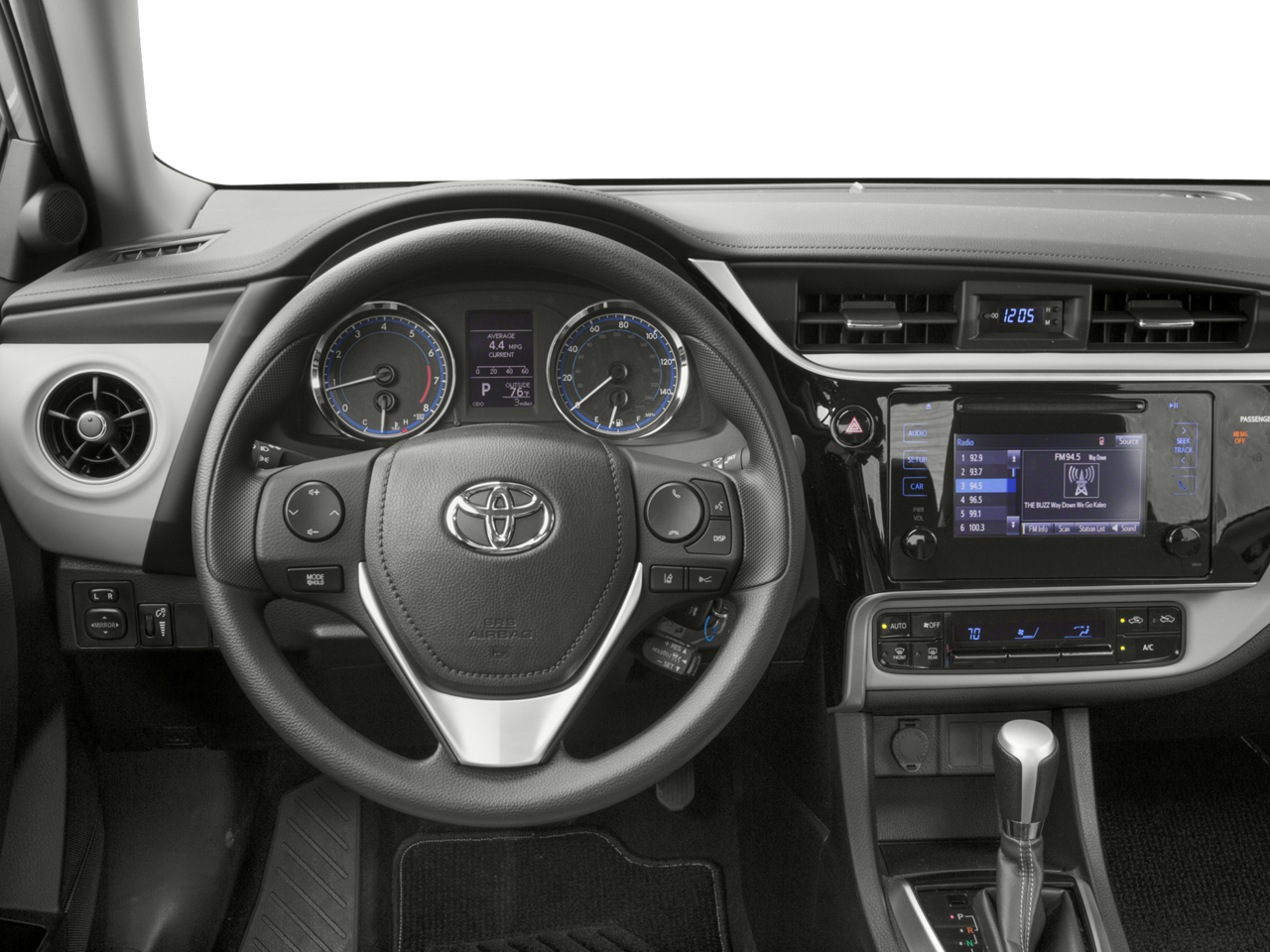 Below is all the standard equipment ABS brakes, Air Conditioning, Automatic temperature control, Tilt & Slide Moonroof, Traction control, 6 Speakers, AM/FM radio, Auto High-beam Headlights, Brake assist, Bumpers: body-color, CD player, Delay-off headlights, Driver door bin, Driver vanity mirror, Dual front impact airbags, Dual front side impact airbags, Electronic Stability Control, Exterior Parking Camera Rear, Fabric Seat Trim, Front anti-roll bar, Front Bucket Seats, Front Center Armrest w/Storage, Front reading lights, Front wheel independent suspension, Fully automatic headlights, Heated door mirrors, Illuminated entry, Knee airbag, LED Daytime Running Lights (DRL), Low tire pressure warning, Occupant sensing airbag, Outside temperature display, Overhead airbag, Panic alarm, Passenger door bin, Passenger vanity mirror, Power door mirrors, Power steering, Power windows, Radio data system, Radio: Entune Audio Plus w/Connected Navigation, Radio: Entune Audio w/6.1 Screen, Rear anti-roll bar, Rear seat center armrest, Rear window defroster, Remote keyless entry, Speed control, Speed-sensing steering, Split folding rear seat, Steering wheel mounted audio controls, Tachometer, Telescoping steering wheel, Tilt steering wheel, Trip computer, Variably intermittent wipers, and Wheels: 16 x 6.5 Wide Vent Steel. Awards:
