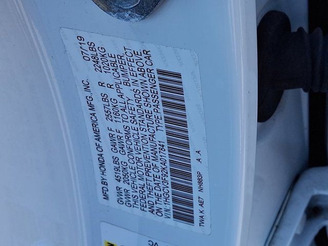 Below is all the standard equipment 2.0L 4-Cylinder DOHC 16V i-VTEC, Navigation System, 10 Speakers, 17 Machine-Finished Alloy Wheels, 4-Wheel Disc Brakes, ABS brakes, Adaptive suspension, Air Conditioning, Alloy wheels, AM/FM radio: SiriusXM, Apple CarPlay/Android Auto, Auto High-beam Headlights, Auto-dimming Rear-View mirror, Automatic temperature control, Blind Spot Information (BSI) System warning, Brake assist, Bumpers: body-color, Compass, Delay-off headlights, Driver door bin, Driver vanity mirror, Dual front impact airbags, Dual front side impact airbags, Electronic Stability Control, Emergency communication system: HondaLink, Exterior Parking Camera Rear, Forward collision: Collision Mitigation Braking System (CMBS) + FCW mitigation, Four wheel independent suspension, Front anti-roll bar, Front Bucket Seats, Front Center Armrest, Front dual zone A/C, Front fog lights, Front reading lights, Fully automatic headlights, Garage door transmitter: HomeLink, Heads-Up Display, Heated & Ventilated Front Bucket Seats, Heated door mirrors, Heated front seats, Heated rear seats, Illuminated entry, Knee airbag, Leather steering wheel, Leather-Trimmed Seats, Low tire pressure warning, Memory seat, Occupant sensing airbag, Outside temperature display, Overhead airbag, Overhead console, Panic alarm, Passenger door bin, Passenger vanity mirror, Power door mirrors, Power driver seat, Power moonroof, Power passenger seat, Power steering, Power windows, Radio data system, Radio: 450-Watt AM/FM/HD Premium Audio System, Rain sensing wipers, Rear anti-roll bar, Rear seat center armrest, Rear window defroster, Remote keyless entry, Security system, Speed control, Speed-sensing steering, Speed-Sensitive Wipers, Split folding rear seat, Steering wheel mounted audio controls, Telescoping steering wheel, Tilt steering wheel, Traction control, Trip computer, Turn signal indicator mirrors, Variably intermittent wipers, and Ventilated front seats.