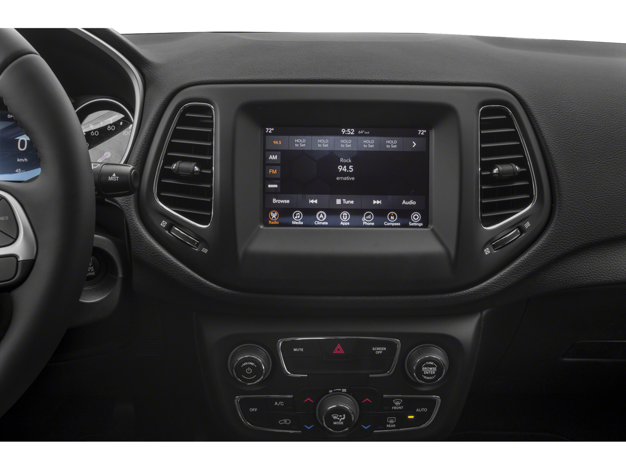 Below is all the standard equipment Cold Weather Group (All-Season Floor Mats, Heated Front Seats, Heated Steering Wheel, Reversible Carpet/Vinyl Cargo Mat, and Windshield Wiper De-Icer), Popular Equipment Group (4-Way Power Lumbar Adjust, Auto-Dimming Rear-View Mirror, Cluster 7.0 Color Driver Info Display, and Power 8-Way Driver/Manual 6-Way Passenger Seats), Quick Order Package 2GJ, 4WD, Power Front/Fixed Rear Full Sunroof, Wheels: 17 x 7.0 Silver Painted Aluminum, 4-Wheel Disc Brakes, 6 Speakers, ABS brakes, Air Conditioning, Alloy wheels, AM/FM radio: SiriusXM, Anti-whiplash front head restraints, Automatic temperature control, Brake assist, Bumpers: body-color, Compass, Delay-off headlights, Driver door bin, Driver vanity mirror, Dual front impact airbags, Dual front side impact airbags, Electronic Stability Control, Four wheel independent suspension, Front anti-roll bar, Front Bucket Seats, Front Center Armrest w/Storage, Front dual zone A/C, Front fog lights, Front reading lights, Fully automatic headlights, Heated door mirrors, Illuminated entry, Knee airbag, Low tire pressure warning, Occupant sensing airbag, Outside temperature display, Overhead airbag, Overhead console, Panic alarm, ParkView Rear Back-Up Camera, Passenger door bin, Passenger vanity mirror, Power door mirrors, Power steering, Power windows, Premium Cloth/Vinyl Bucket Seats, Radio: Uconnect 4 w/7 Display, Rear anti-roll bar, Rear seat center armrest, Rear window defroster, Rear window wiper, Remote keyless entry, Roof rack: rails only, Speed control, Split folding rear seat, Spoiler, Steering wheel mounted audio controls, Tachometer, Telescoping steering wheel, Tilt steering wheel, Traction control, Trip computer, and Variably intermittent wipers.