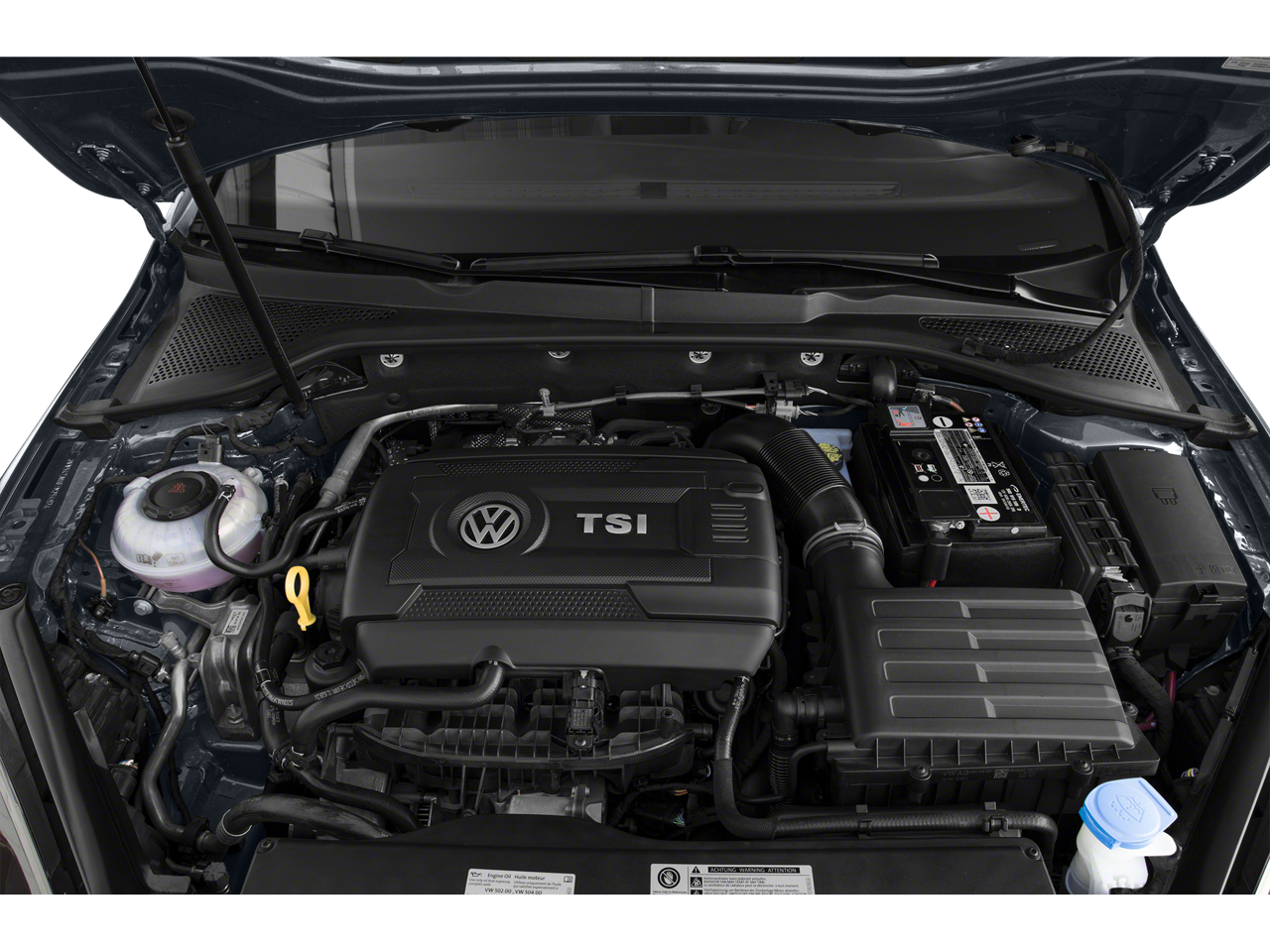 Below is all the standard equipment 4-Wheel Disc Brakes, 9 Speakers, ABS brakes, Active Blind Spot Monitor, Adaptive suspension, Air Conditioning, Alloy wheels, AM/FM radio: SiriusXM, Anti-whiplash front head restraints, Auto High-beam Headlights, Auto-dimming Rear-View mirror, Automatic temperature control, Brake assist, Bumpers: body-color, CD player, Compass, Delay-off headlights, Driver door bin, Driver vanity mirror, Dual front impact airbags, Dual front side impact airbags, Electronic Stability Control, Emergency communication system: VW Car-Net services (capabilities require enrollment or subscription), Exterior Parking Camera Rear, First Aid Kit, Forward collision: FCW w/Autonomous Emergency Braking mitigation, Four wheel independent suspension, Frameless Auto-Dimming Rearview Mirror (GRV), Front anti-roll bar, Front Bucket Seats, Front Center Armrest, Front dual zone A/C, Front fog lights, Front reading lights, Fully automatic headlights, Heated door mirrors, Heated front seats, Heated Front Top Sport Seats, Illuminated entry, Lane Departure Warning System, Leather Seating Surfaces, Leather Shift Knob, Low tire pressure warning, Navigation System, Occupant sensing airbag, Outside temperature display, Overhead airbag, Overhead console, Panic alarm, Passenger door bin, Passenger vanity mirror, Power door mirrors, Power driver seat, Power moonroof, Power passenger seat, Power steering, Power windows, Radio data system, Radio: Discover Media w/8 Touchscreen Navigation, Rain sensing wipers, Rear anti-roll bar, Rear reading lights, Rear seat center armrest, Rear window defroster, Rear window wiper, Remote keyless entry, Roadside Assistance Kit, Rubber Mats Kit, Speed control, Speed-sensing steering, Speed-Sensitive Wipers, Split folding rear seat, Spoiler, Sport steering wheel, Steering wheel mounted audio controls, Tachometer, Telescoping steering wheel, Tilt steering wheel, Traction control, Trip computer, Turn signal indicator mirrors, Variably intermittent wipers, VW App-Connect (w/Apple CarPlay, Android Auto & MirrorLink), and Wheels: 18 5-Spoke 2-Tone Machined Alloy.