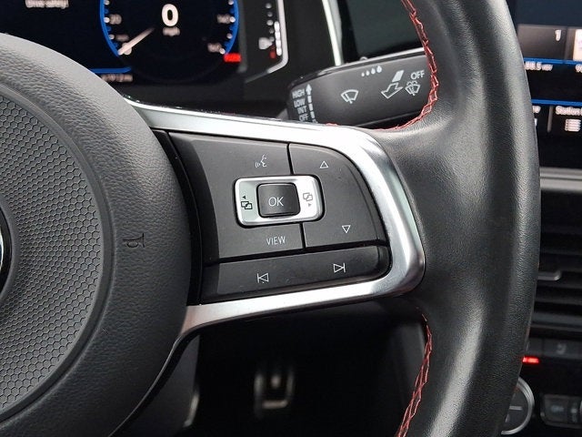Below is all the standard equipment Volkswagen Certified Pre-Owned Certified, 4-Wheel Disc Brakes, 9 Speakers, ABS brakes, Adaptive suspension, Air Conditioning, Alloy wheels, AM/FM radio: SiriusXM with 360L, Auto-dimming Rear-View mirror, Automatic temperature control, Brake assist, Bumpers: body-color, Delay-off headlights, Driver door bin, Driver vanity mirror, Dual front impact airbags, Dual front side impact airbags, Electronic Stability Control, Emergency communication system: VW Car-Net services (capabilities require enrollment or subscription), Exterior Parking Camera Rear, Four wheel independent suspension, Front anti-roll bar, Front Bucket Seats, Front Center Armrest, Front dual zone A/C, Front reading lights, Fully automatic headlights, Heated door mirrors, Heated front seats, Htd & Actively Ventilated Fr Comfort Sport Seats, Illuminated entry, Leather Seating Surfaces, Leather Shift Knob, Low tire pressure warning, Memory seat, Occupant sensing airbag, Outside temperature display, Overhead airbag, Overhead console, Panic alarm, Passenger door bin, Passenger vanity mirror, Power door mirrors, Power driver seat, Power moonroof: Panoramic, Power steering, Power windows, Radio data system, Radio: Composition Media w/8 Touchscreen, Rain sensing wipers, Rear anti-roll bar, Rear reading lights, Rear seat center armrest, Rear window defroster, Remote CD player, Remote keyless entry, Security system, Speed control, Speed-sensing steering, Split folding rear seat, Spoiler, Sport steering wheel, Steering wheel mounted audio controls, Tachometer, Telescoping steering wheel, Tilt steering wheel, Traction control, Trip computer, Turn signal indicator mirrors, Variably intermittent wipers, Ventilated front seats, and Wheels: 18 Two-Tone Twin 5-Spoke Machined Alloy.