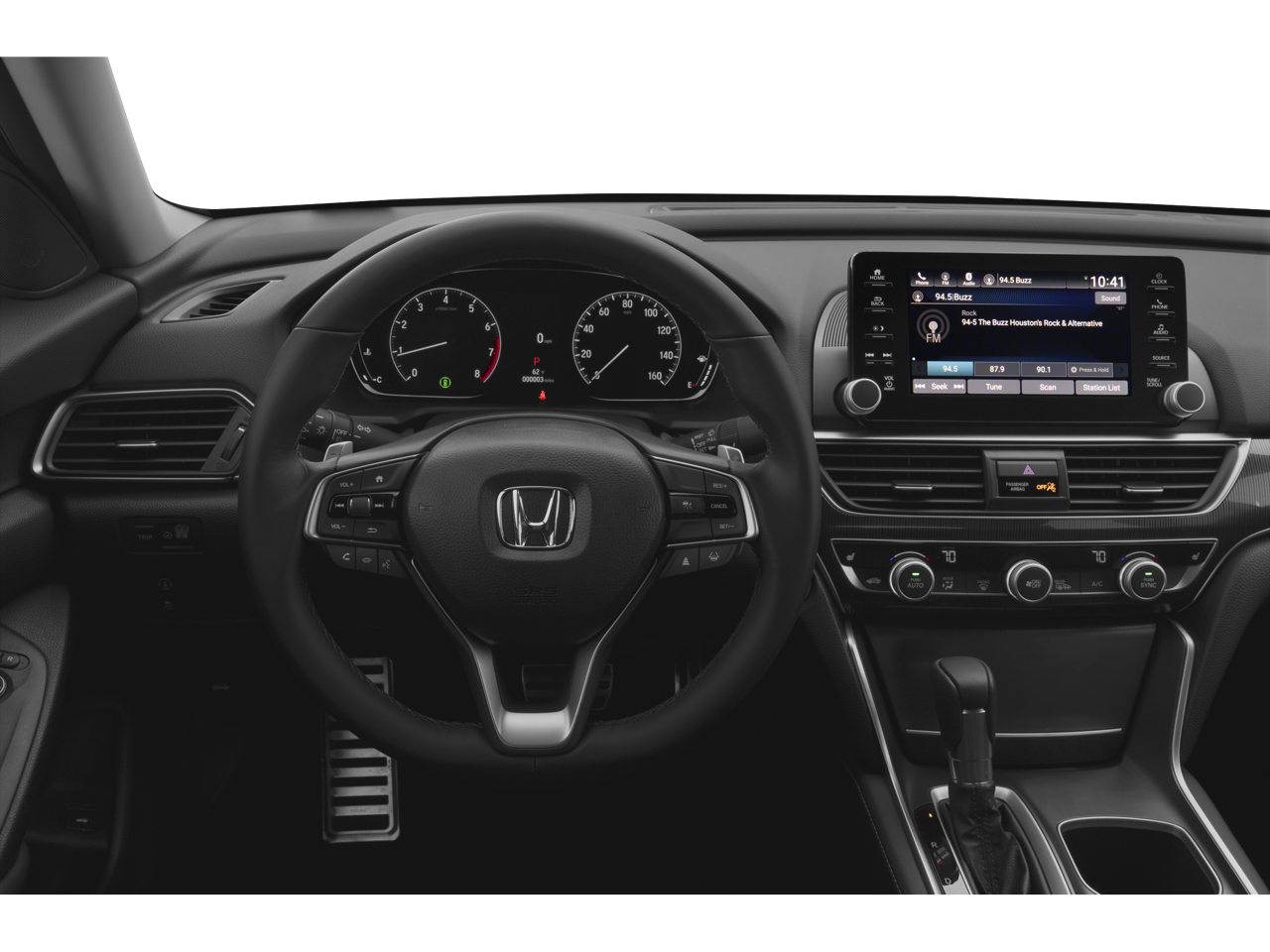 Below is all the standard equipment Leather, 4-Wheel Disc Brakes, 8 Speakers, ABS brakes, Adaptive Cruise Control: Adaptive Cruise Control (ACC) with Low-Speed Follow, Air Conditioning, Alloy wheels, AM/FM radio, Apple CarPlay/Android Auto, Auto High-beam Headlights, Automatic temperature control, Brake assist, Bumpers: body-color, Delay-off headlights, Driver door bin, Driver vanity mirror, Dual front impact airbags, Dual front side impact airbags, Electronic Stability Control, Emergency communication system: HondaLink, Exterior Parking Camera Rear, Forward collision: Collision Mitigation Braking System (CMBS) + FCW mitigation, Four wheel independent suspension, Front anti-roll bar, Front Bucket Seats, Front Center Armrest, Front dual zone A/C, Front fog lights, Front reading lights, Fully automatic headlights, Heated door mirrors, Heated Front Bucket Seats, Heated front seats, Illuminated entry, Knee airbag, Lane Departure Warning System, Leather Shift Knob, Leather steering wheel, Low tire pressure warning, Occupant sensing airbag, Outside temperature display, Overhead airbag, Overhead console, Panic alarm, Passenger door bin, Passenger vanity mirror, Perforated Leather Seat Trim, Power door mirrors, Power driver seat, Power passenger seat, Power steering, Power windows, Radio data system, Radio: 180-Watt AM/FM Audio System, Rear anti-roll bar, Rear seat center armrest, Rear window defroster, Remote keyless entry, Security system, Speed control, Speed-sensing steering, Speed-Sensitive Wipers, Split folding rear seat, Spoiler, Steering wheel mounted audio controls, Tachometer, Telescoping steering wheel, Tilt steering wheel, Traction control, Trip computer, Variably intermittent wipers, and Wheels: 19 Machine-Finished Alloy w/Black Inserts.