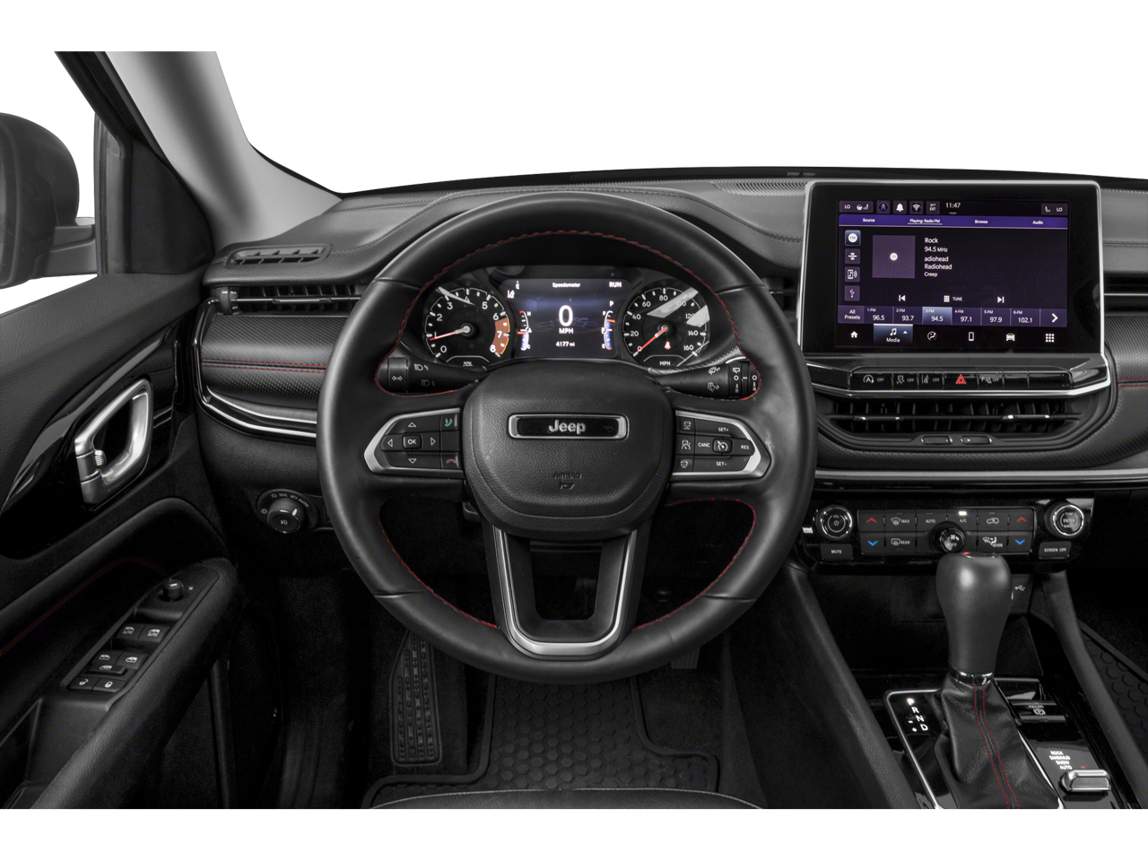 Below is all the standard equipment Quick Order Package 2GE, Trailhawk Convenience Group (115V Auxiliary Power Outlet, 2nd Row USB Type A/C Charge Only, Heated Front Seats, Leather Wrapped Steering Wheel, Power 2-Way Driver Lumbar Adjust, Power Adjust 8-Way Driver Seat, Remote Start System, Reversible Carpet/Vinyl Cargo Mat, Vehicle Information Center, and Windshield Wiper De-Icer), FCA US LLC Certified Pre-Owned Certified, 4WD, 10.1 Touchscreen Display, 4-Wheel Disc Brakes, 4.334 Axle Ratio, 6 Speakers, ABS brakes, Air Conditioning, Alloy wheels, AM/FM radio: SiriusXM, Anti-whiplash front head restraints, Auto High-beam Headlights, Auto-dimming Rear-View mirror, Automatic temperature control, Brake assist, Bumpers: body-color, Compass, Delay-off headlights, Disassociated Touchscreen Display, Driver door bin, Driver vanity mirror, Dual front impact airbags, Dual front side impact airbags, Electronic Stability Control, Emergency communication system: SiriusXM Guardian, Four wheel independent suspension, Front anti-roll bar, Front Bucket Seats, Front Center Armrest w/Storage, Front dual zone A/C, Front fog lights, Front License Plate Bracket, Front reading lights, Fully automatic headlights, Global Telematics Box Module (TBM), Heated door mirrors, Illuminated entry, Knee airbag, Leather Shift Knob, Low tire pressure warning, Occupant sensing airbag, Outside temperature display, Overhead airbag, Overhead console, Panic alarm, ParkView Rear Back-Up Camera, Passenger door bin, Passenger vanity mirror, Power door mirrors, Power steering, Power windows, Premium Cloth/Leather Trim Bucket Seats, Radio: Uconnect 5 w/10.1 Display, Rain sensing wipers, Rear anti-roll bar, Rear seat center armrest, Rear window defroster, Rear window wiper, Remote keyless entry, Roof rack: rails only, Security system, Speed control, Split folding rear seat, Spoiler, Steering wheel mounted audio controls, Tachometer, Telescoping steering wheel, Tilt steering wheel, Traction control, Trip computer, Turn signal indicator mirrors, Variably intermittent wipers, and Wheels: 17 x 6.5 Painted Diamond Cut Aluminum.