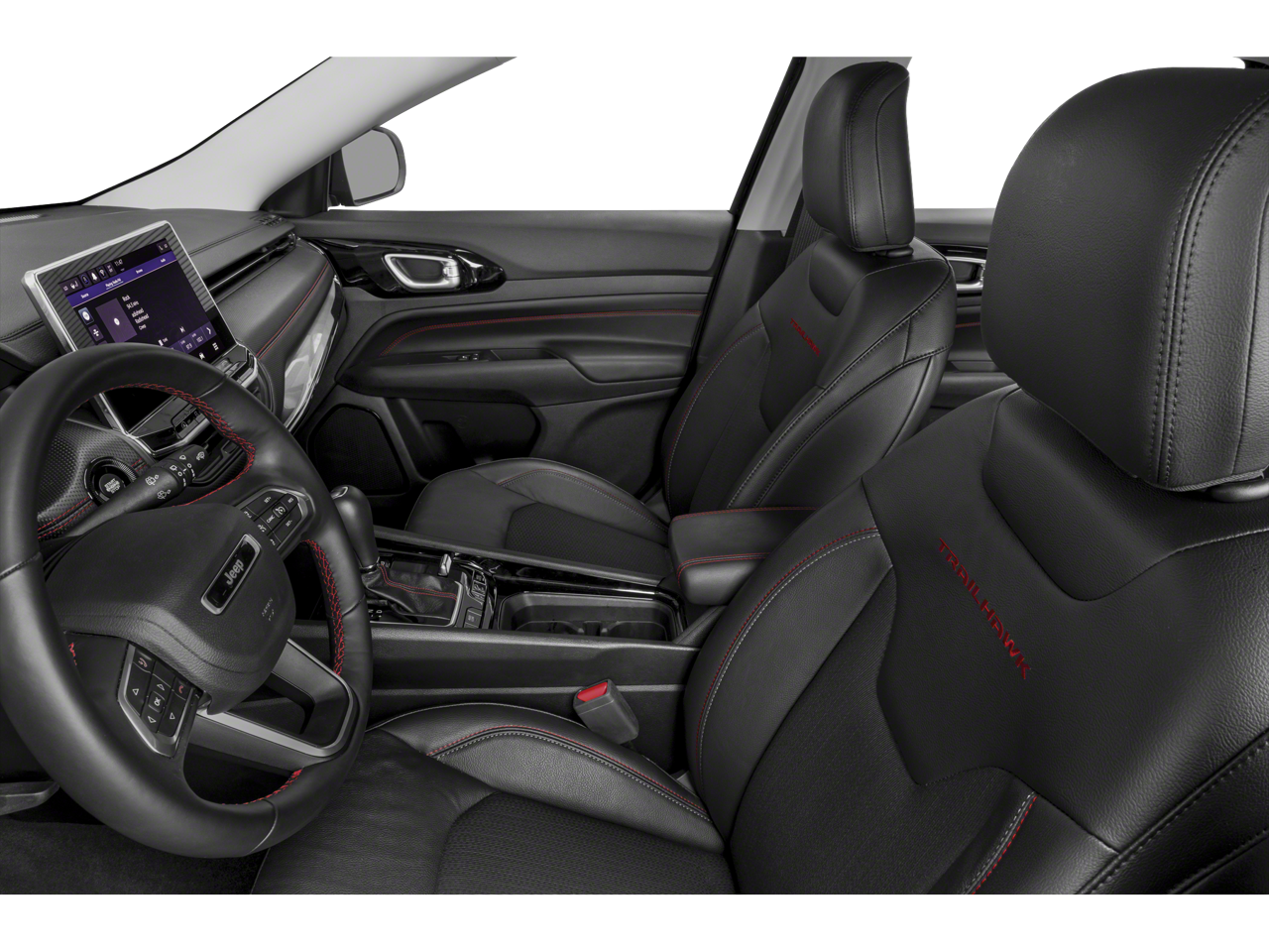 2022 Jeep Compass Trailhawk in Bright White Clearcoat with Ruby Red/Black Cloth.