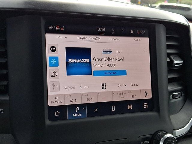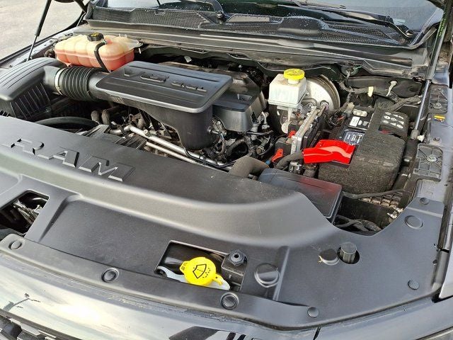 Below is all the standard equipment Bed Utility Group (MOPAR 4 Adjustable Cargo Tie-Down Hooks, MOPAR Deployable Bed Step, MOPAR Spray In Bedliner, and Pick-Up Box Lighting), Big Horn Level B Equipment Group (DISC) (115V Auxiliary Power Outlet, 115V Auxiliary Rear Power Outlet, 400W Inverter, 4G LTE Wi-Fi Hot Spot, 8.4 Touchscreen Display, Air Conditioning ATC w/Dual Zone Control, Apple CarPlay, Auto-Dimming Exterior Driver Mirror, Auto-Dimming Rear-View Mirror, Black Premium Power Mirrors (GUL), Bluetooth® Handsfree Phone & Audio, Class IV Receiver Hitch, Cluster 7.0 TFT Color Display, Connectivity - US/Canada, Exterior Mirrors Courtesy Lamps, Exterior Mirrors w/Supplemental Signals, Foam Bottle Insert (Door Trim Panel), For More Info, Call 800-643-2112, Glove Box Lamp, Google Android Auto, Heated Front Seats, Heated Steering Wheel, Integrated Center Stack Radio, Media Hub w/2 Charge Only USBs, ParkSense Front/Rear Park Assist w/Stop, Power 2-Way Driver Lumbar Adjust, Power 8-Way Driver Seat, Power Adjustable Pedals, Radio: Uconnect 5 W w/8.4 Display, Rear Dome w/On/Off Switch Lamp, Rear Power Sliding Window, Rear Window Defroster, Remote Start System, Security Alarm, SiriusXM Radio Service, SiriusXM Satellite Radio, Sun Visors w/Illuminated Vanity Mirrors, Universal Garage Door Opener, and USB Host Flip), Night Edition (3 Rear Seat Head Restraints, 4 Way Front Headrests, Accent Color Premium Power Mirrors, Anti-Spin Differential Rear Axle, Black Exterior Truck Badging, Black Headlamp Bezels, Black Interior Accents, Black Painted Exterior Mirrors Caps, Body Color Front Bumper, Body Color Rear Bumper w/Step Pads, Bucket Seats, Delete LED Lamp - Floor Console Bin, Deluxe Cloth Bucket Seats, Dual Exhaust w/Black Tips, Front Seat Back Map Pockets, Full Length Floor Console, Grille Surround 1 Black Texture 2 Black, Manual Adjust 4-Way Front Passenger Seat, Rear 60/40 Folding Seat, and Wheels: 20 x 9.0 Premium Paint/Polished), Quick Order Package 23Z Big Horn (Big Horn Badge), 4-Wheel Disc Brakes, 48V Belt Starter Generator, 6 Speakers, ABS brakes, Air Conditioning, Alloy wheels, AM/FM radio, Black Exterior Mirrors, Brake assist, Bumpers: chrome, Cloth Bench Seat, Compass, Convex Wide-Angle Mirror Insert, Delay-off headlights, Driver door bin, Dual front impact airbags, Dual front side impact airbags, Electronic Stability Control, Emergency communication system: SiriusXM Guardian, Front anti-roll bar, Front Center Armrest w/Storage, Front fog lights, Front License Plate Bracket, Front reading lights, Front wheel independent suspension, Fully automatic headlights, Global Telematics Box Module (TBM), GPS Antenna Input, Heated door mirrors, Illuminated entry, Integrated Voice Command w/Bluetooth®, Leather steering wheel, Low tire pressure warning, Occupant sensing airbag, Outside temperature display, Overhead airbag, Overhead console, Panic alarm, ParkView Rear Back-Up Camera, Passenger door
