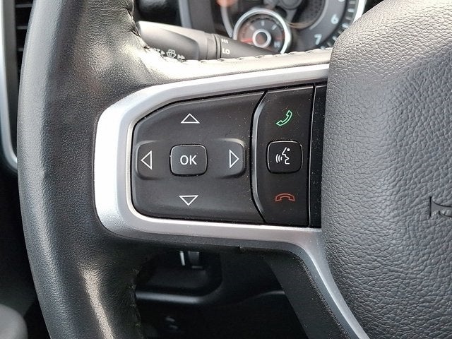 Below is all the standard equipment Big Horn Level 1 Equipment Group (2nd Row In Floor Storage Bins, 4G LTE Wi-Fi Hot Spot, 8.4 Touchscreen Display, Apple CarPlay, Auto-Dimming Exterior Driver Mirror, Auto-Dimming Rear-View Mirror, Black Exterior Mirrors, Black Premium Power Mirrors, Bluetooth® Handsfree Phone & Audio, Class IV Receiver Hitch, Cluster 3.5 TFT Color Display, Connectivity - US/Canada, Convex Wide-Angle Mirror Insert, Exterior Mirrors Courtesy Lamps, Exterior Mirrors w/Heating Element, Exterior Mirrors w/Supplemental Signals, For Details, Visit DriveUconnect.com, Global Telematics Box Module (TBM), Glove Box Lamp, Google Android Auto, GPS Antenna Input, Integrated Center Stack Radio, Power 2-Way Driver Lumbar Adjust, Power 8-Way Driver Seat, Power Adjustable Pedals, Power-Folding Mirrors, Radio: Uconnect 5 W w/8.4 Display, Rear Dome w/On/Off Switch Lamp, Rear Power Sliding Window, Rear Window Defroster, SiriusXM Radio Service, SiriusXM Satellite Radio, Sun Visors w/Illuminated Vanity Mirrors, Universal Garage Door Opener, and USB Host Flip), Quick Order Package 23Z Big Horn (Big Horn Badge), Certified Pre-Owned Certified, Air Conditioning ATC w/Dual Zone Control, All R1 High Radios, All Radio Equipped Vehicles, Connected Travel & Traffic Services, Disassociated Touchscreen Display, GPS Navigation, HD Radio, Integrated Voice Command w/Bluetooth®, Radio: Uconnect 5 Nav w/8.4 Display, SiriusXM w/360L, Trailer Brake Control, Wheels: 20 x 9 Aluminum Chrome Clad (WRK), 3 Rear Seat Head Restraints, 3.21 Rear Axle Ratio, 3.55 Rear Axle Ratio, 4 Way Front Headrests, 4-Wheel Disc Brakes, 48V Belt Starter Generator, 6 Speakers, ABS brakes, Air Conditioning, Alloy wheels, AM/FM radio, Brake assist, Bumpers: chrome, Cloth Bench Seat, Cluster 7.0 TFT Color Display, Compass, Delay-off headlights, Driver door bin, Dual front impact airbags, Dual front side impact airbags, Electronic Stability Control, Emergency communication system: SiriusXM Guardian, Front anti-roll bar, Front Center Armrest w/Storage, Front fog lights, Front License Plate Bracket, Front reading lights, Front Seat Back Map Pockets, Front wheel independent suspension, Fully automatic headlights, Heated door mirrors, Illuminated entry, Leather steering wheel, Low tire pressure warning, Occupant sensing airbag, Outside temperature display, Overhead airbag, Overhead console, Panic alarm, ParkView Rear Back-Up Camera, Passenger door bin, Passenger vanity mirror, Power door mirrors, Power steering, Power windows, Radio data system, Radio: Uconnect 3 w/5 Display, Rear 60/40 Folding Seat, Rear anti-roll bar, Rear seat center armrest, Rear step bumper, Rear Wheelhouse Liners, Remote keyless entry, Speed control, Split folding rear seat, Steering wheel mounted audio controls, Tachometer, Telescoping steering wheel, Tilt st