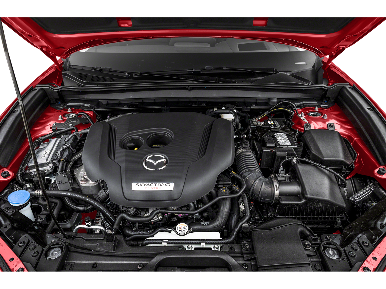 Below is all the standard equipment 12 Speakers, 3.841 Axle Ratio, 4-Wheel Disc Brakes, ABS brakes, Air Conditioning, Alloy wheels, AM/FM radio: SiriusXM, AppLink/Apple CarPlay and Android Auto, Auto High-beam Headlights, Auto-dimming Rear-View mirror, Automatic temperature control, Black Lug Nuts & Black Wheel Locks, Brake assist, Bumpers: body-color, Cargo Cover, Compass, Delay-off headlights, Driver door bin, Driver vanity mirror, Dual front impact airbags, Dual front side impact airbags, Electronic Stability Control, Emergency communication system: Mazda Connected Services (3-year complimentary trial included), Exterior Parking Camera Rear, Front anti-roll bar, Front Bucket Seats, Front Center Armrest, Front dual zone A/C, Front reading lights, Front wheel independent suspension, Fully automatic headlights, Heads-Up Display, Heated door mirrors, Heated Front Bucket Seats, Heated front seats, Heated steering wheel, Illuminated entry, Knee airbag, Leather Seat Trim, Leather Shift Knob, Leather steering wheel, Low tire pressure warning, Machine Gray Metallic Paint, MAZDA CONNECT Infotainment System, Memory seat, Navigation system: MAZDA CONNECT, Occupant sensing airbag, Outside temperature display, Overhead airbag, Overhead console, Panic alarm, Passenger door bin, Passenger vanity mirror, Power door mirrors, Power driver seat, Power Liftgate, Power moonroof, Power steering, Power windows, Radio data system, Radio: AM/FM/HD Audio System w/Mazda Navigation, Rain sensing wipers, Rear seat center armrest, Rear side impact airbag, Rear window defroster, Rear window wiper, Remote keyless entry, Speed control, Speed-sensing steering, Split folding rear seat, Spoiler, Steering wheel mounted audio controls, Tachometer, Telescoping steering wheel, Tilt steering wheel, Traction control, Trip computer, Turn signal indicator mirrors, Variably intermittent wipers, and Wheels: 18 x 7J Aluminum Alloy.