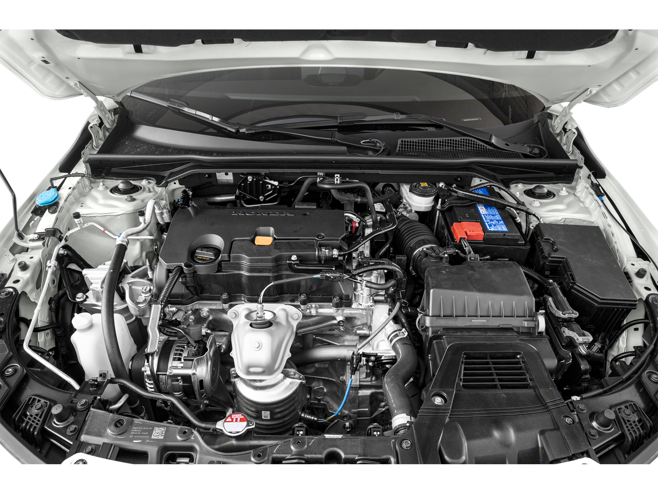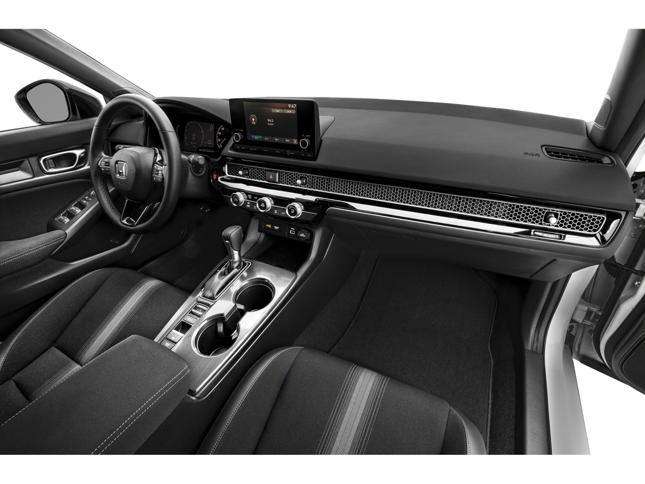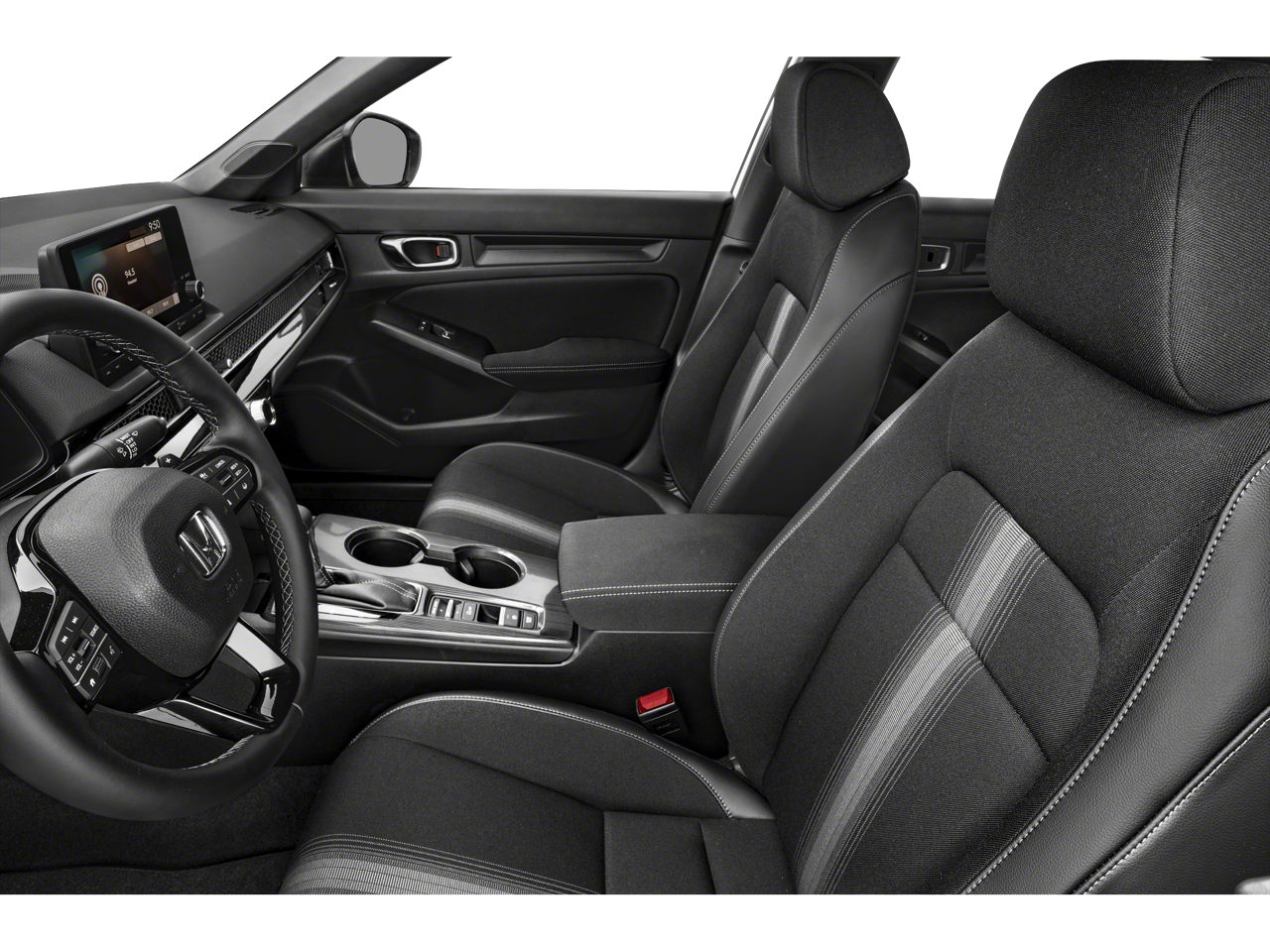 Below is all the standard equipment Cloth, 4-Wheel Disc Brakes, 8 Speakers, ABS brakes, Adaptive Cruise Control: Adaptive Cruise Control (ACC) with Low-Speed Follow, Air Conditioning, Alloy wheels, AM/FM radio, Apple CarPlay/Android Auto, Auto High-beam Headlights, Automatic temperature control, Brake assist, Bumpers: body-color, Cloth Seat Trim, Delay-off headlights, Driver door bin, Driver vanity mirror, Dual front impact airbags, Dual front side impact airbags, Electronic Stability Control, Emergency communication system: HondaLink, Exterior Parking Camera Rear, Four wheel independent suspension, Front anti-roll bar, Front Bucket Seats, Front Center Armrest, Front reading lights, Fully automatic headlights, Illuminated entry, Knee airbag, Leather Shift Knob, Leather steering wheel, Low tire pressure warning, Occupant sensing airbag, Outside temperature display, Overhead airbag, Panic alarm, Passenger door bin, Passenger vanity mirror, Power door mirrors, Power steering, Power windows, Radio data system, Radio: 180-Watt Audio System w/8 Speakers, Rear anti-roll bar, Rear side impact airbag, Rear window defroster, Remote keyless entry, Security system, Speed control, Speed-sensing steering, Steering wheel mounted audio controls, Tachometer, Telescoping steering wheel, Tilt steering wheel, Traction control, Trip computer, and Wheels: 18 Gloss Black Alloy.