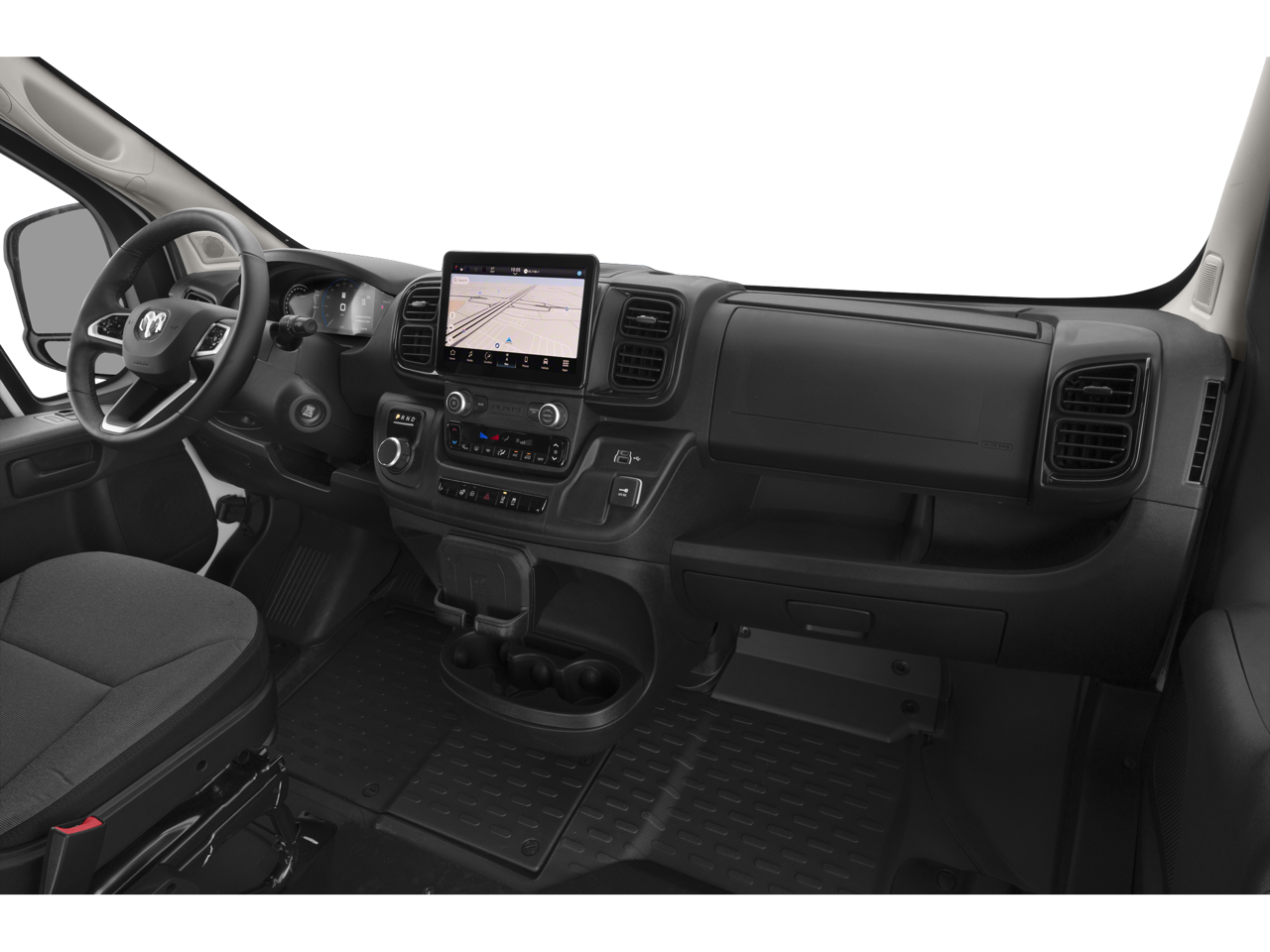 Below is all the standard equipment Quick Order Package 24A, Navigation System, 10.09 Axle Ratio, 16 x 6 Steel Wheels, 4 Speakers, 4-Wheel Disc Brakes, ABS brakes, Air Conditioning, AM/FM radio: SiriusXM, Apple CarPlay/Android Auto, Auto High-beam Headlights, Auto-dimming Rear-View mirror, Bodyside moldings, Brake assist, Cloth Flat Driver's Seat, Driver door bin, Driver's Seat Mounted Armrest, Dual front impact airbags, Electronic Stability Control, Emergency communication system, Front anti-roll bar, Front fog lights, Front License Plate Bracket, Front reading lights, Front wheel independent suspension, Fully automatic headlights, Heated door mirrors, Heavy Duty Suspension, Illuminated entry, Leather steering wheel, Low tire pressure warning, Manufacturer's Statement of Origin, Occupant sensing airbag, Outside temperature display, Overhead airbag, Overhead console, ParkView Rear Back-Up Camera, Passenger door bin, Power door mirrors, Power steering, Power windows, Radio: Uconnect 5 Nav w/10.1 Display, Rain sensing wipers, Rear anti-roll bar, Remote keyless entry, Steering wheel mounted audio controls, Telescoping steering wheel, Traction control, Trip computer, Turn signal indicator mirrors, and Variably intermittent wipers.