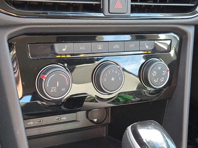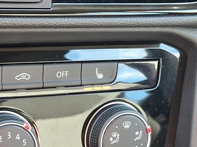 Below is all the standard equipment Volkswagen Certified Pre-Owned Certified, Wheels: 18 2-Tone Machined Alloy, 4-Wheel Disc Brakes, 5.20 Axle Ratio, 6 Speakers, ABS brakes, Active Blind Spot Monitor, Air Conditioning, Alloy wheels, AM/FM radio, Auto High-beam Headlights, Brake assist, Bumpers: body-color, Cloth Seating Surfaces, Compass, Delay-off headlights, Driver door bin, Driver vanity mirror, Dual front impact airbags, Dual front side impact airbags, Electronic Stability Control, Emergency communication system: VW Car-Net Safe & Secure 5-year, Exterior Parking Camera Rear, Four wheel independent suspension, Front anti-roll bar, Front Bucket Seats, Front Center Armrest, Front reading lights, Front Strut Rear Multi-Link Suspension, Fully automatic headlights, Heated door mirrors, Heated Front Bucket Seats, Heated front seats, Heated steering wheel, Illuminated entry, Leather Shift Knob, Low tire pressure warning, Occupant sensing airbag, Outside temperature display, Overhead airbag, Overhead console, Panic alarm, Passenger door bin, Passenger vanity mirror, Power door mirrors, Power steering, Power windows, Radio data system, Radio: Composition Color AM/FM, Rain sensing wipers, Rear anti-roll bar, Rear seat center armrest, Rear window defroster, Rear window wiper, Remote keyless entry, Speed control, Speed-sensing steering, Split folding rear seat, Spoiler, Steering wheel mounted audio controls, Tachometer, Telescoping steering wheel, Tilt steering wheel, Traction control, Trip computer, and Variably intermittent wipers.