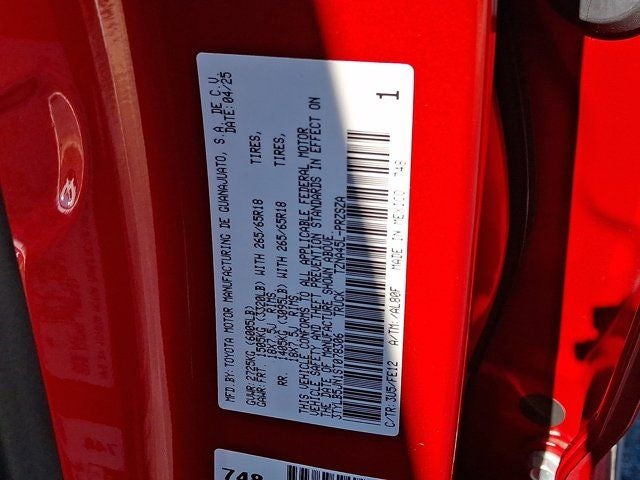 Below is all the standard equipment 4WD, 3.583 Axle Ratio, 4-Wheel Disc Brakes, 6 Speakers, ABS brakes, Air Conditioning, Alloy wheels, AM/FM radio: SiriusXM, Anti-whiplash front head restraints, Apple CarPlay/Android Auto, Auto High-beam Headlights, Auto-dimming Rear-View mirror, Automatic temperature control, Brake assist, Bumpers: body-color, Driver door bin, Driver vanity mirror, Dual front impact airbags, Dual front side impact airbags, Electronic Stability Control, Emergency communication system: Safety Connect (1-year trial), Exterior Parking Camera Rear, Fabric Seat Trim, Four wheel independent suspension, Front anti-roll bar, Front Bucket Seats, Front Center Armrest, Front fog lights, Front reading lights, Fully automatic headlights, Heated door mirrors, Illuminated entry, Knee airbag, Leather Shift Knob, Leather steering wheel, Low tire pressure warning, Occupant sensing airbag, Outside temperature display, Overhead airbag, Overhead console, Panic alarm, Passenger door bin, Passenger vanity mirror, Power door mirrors, Power steering, Power windows, Radio: 8 Toyota Audio Multimedia, Rear step bumper, Rear window defroster, Remote keyless entry, Security system, Speed control, Speed-sensing steering, Split folding rear seat, Steering wheel mounted audio controls, Tachometer, Telescoping steering wheel, Tilt steering wheel, Traction control, Trip computer, Turn signal indicator mirrors, Variably intermittent wipers, and Wheels: 18 TRD Sport Alloy.